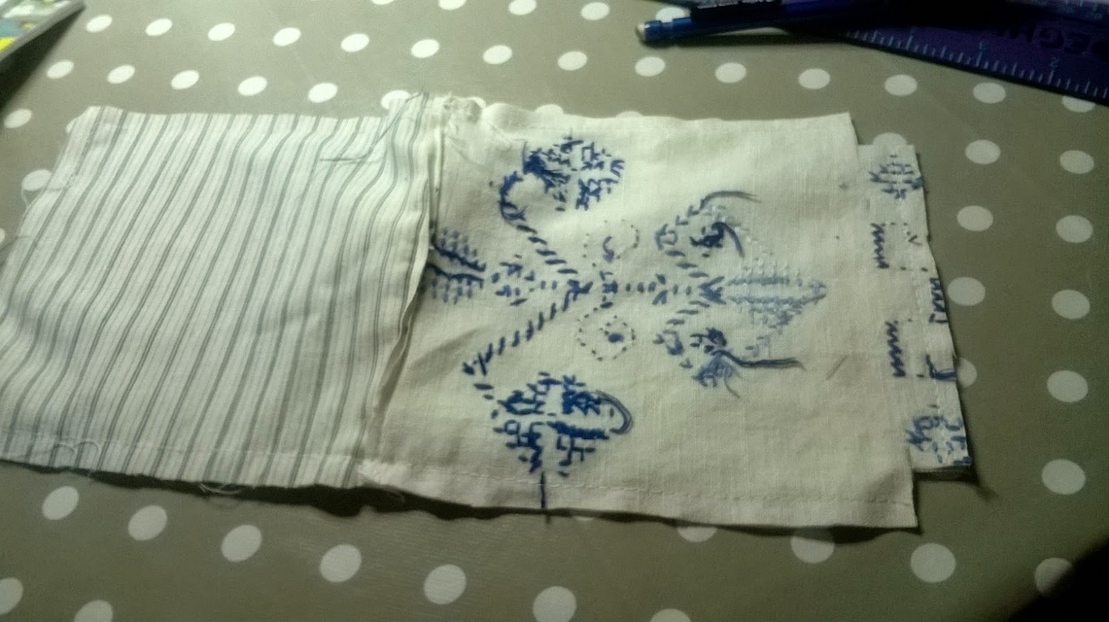 Kaikenlaista on tullut ostettua kirpputoreilta, niin kuin tämäkin pöytäliina, jossa oli paikoitellen jotain ruostetahroja, joten se ei tietenkään enää kelvannut siihen hommaan. Siis mittailemaan sopivia tahrattomia palasia.